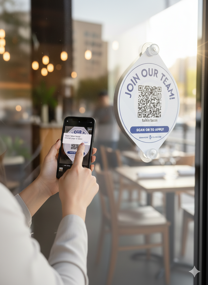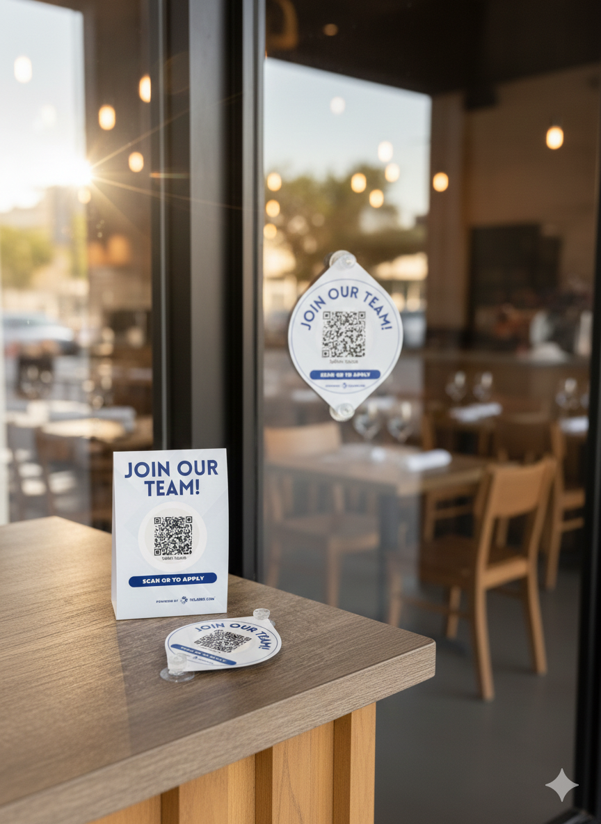 Display the custom QR code sign/tent at your location. Candidate opens an application with all your brand, business name and logo, transmitting trust and professionalism.